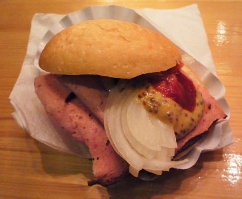 ドイツと言えば、やっぱりソーセージ!!▲ って、ベタな発想かもですが、やっぱりこういうイベントに来ると、 「いかにも!」という典型的なことをやりたくなるもの(笑) ちなみに、ヴァイス・ブルスト(白ソーセージ)は、 本場ドイツでは基本的に午前中に食べるのが伝統で、 皮をむいて食べるものなんですが、そのへんのことは 完全に無視して、皮ごとペロリと完食してきました A^_^; 右上のバーガーみたいなの ↗ は、レバーケーゼ・サンドイッチ。 こちらのブース▼で買ってきました。