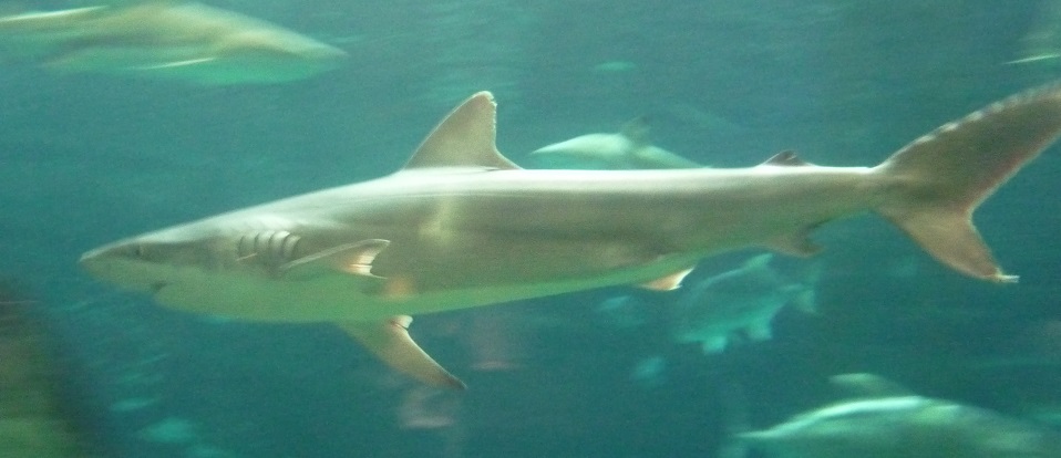 それも一匹や二匹ではありません!! 私が自分なりに確認できただけでも、アカシュモクザメの子供が二尾と、上に画像を載せた種類不明なメジロザメ系の子供たちが二尾。元々ここの大水槽には、これでもかというほどウジャウジャと多種多様に鮫がいるので、もしかしたら見落としがあって、他にももっと新顔の鮫がいたかもしれませんが、体調不良のため途中で電池切れ状態になってコタツに座り込んでいた私目線では、これが精いっぱいでした m(_ _)m