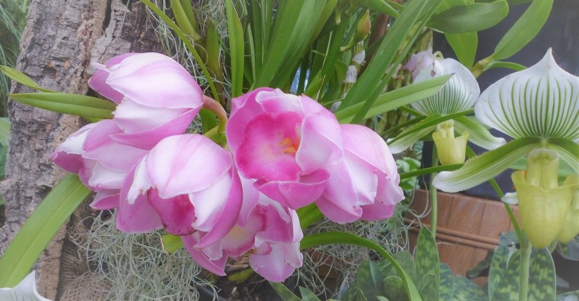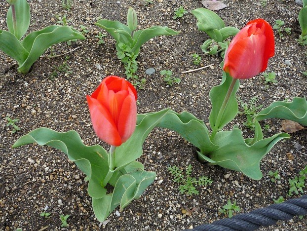 上の画像☝は、自然交配で勝手に色が混ざったものと思われる、不自然に赤と黄色が混じり合った謎のチューリップ。