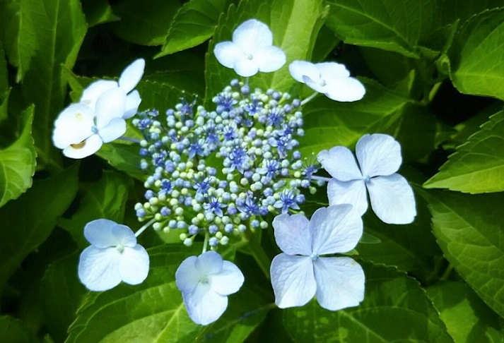 この日は梅雨の只中で、天気予報によると雨とか曇りとかになっていたので、てっきり日焼け対策不要の一日になるものと思っていたのですが、予想外にピーカンの猛暑でしたw 強烈な日射しを避けるべく、私たちはたまたま近くの休憩所に駆け込んだんですが、そこで思いがけず、季節の花々を堪能することができました 🌺 公園内の休憩所というと、簡易な屋根とベンチがついているだけの小ぢんまりとした空間を思い浮かべがちですが、ここは何やら巨大な施設で、かなり広々とした小奇麗な空間でした。奥に進むと、これまた広々とした庭園があり、手入れの行き届いた緑豊かな景色を眺めながら、ゆったりと休むことができます。休憩所のガラス戸を開いて外の庭園を散策することもできて、そこで、上の画像のような綺麗な紫陽花を発見♬ 存分に涼ませていただきました 🎐