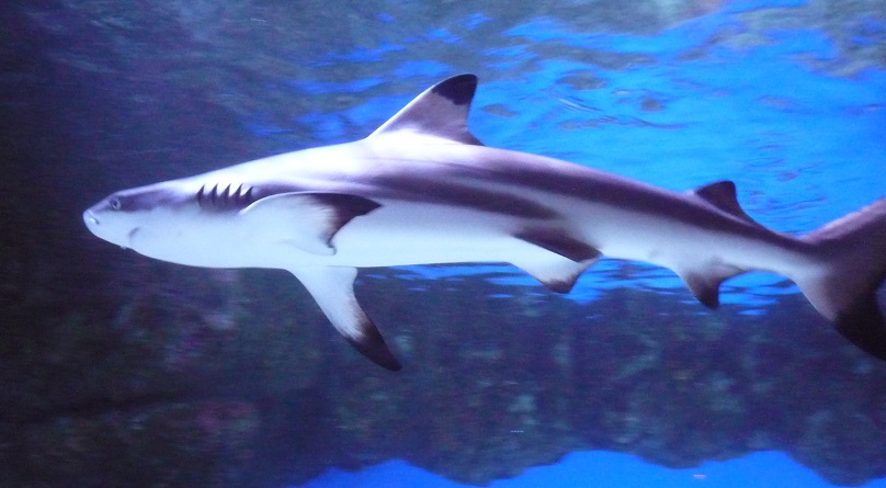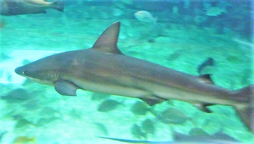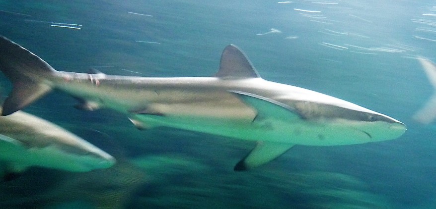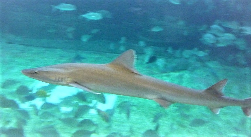 上の画像をご覧ください☝ 私の画像では不鮮明でわかりづらいですが、上の方を泳いでいる大きいめの鮫がツマグロで、少し後ろの下の方に写っている小さい個体が、ハナザメの稚魚です。特徴のある長い鼻(吻)と、くっきりとした尾鰭下葉の黒い斑点。メジロザメ系は区別が難しい上に、幼魚のときには特徴がはっきり出ていないことが多いため、なかなか種の特定がしづらい、という話は以前から度々していましたが、この子たちについてはハナザメで間違いないと、我らがサメ会選任博士、水産学部分類学専攻のFさん(← 前回のサメ会の日記参照)が断言しているので、もう確実でしょう。私でも一目に「あ、ホントだ」とわかるほど、確かにはっきりとハナザメの特徴が出ていましたしね。