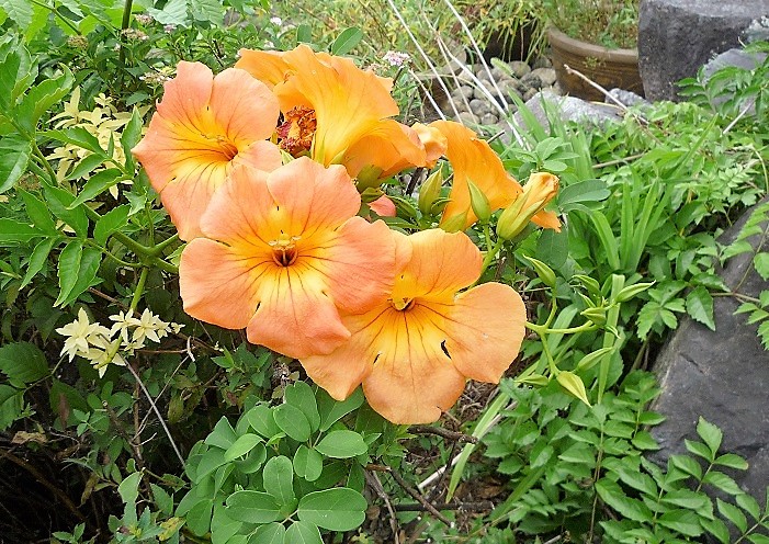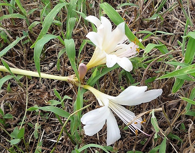 花びらの感じはいかにもナツズイセン(リコリス・スクアミゲラ)っぽいのですが、かなり白っぽいというか、蕾が微かにピンク色を帯びている白いリコリス、という感じでした。でもたぶん、ナツズイセンだと思います。リコリスは色味の違う他の種のリコリスの近くで地植えしていると、自然交配してだんだん色が違ってくることがよくありますからね。(追記:オフホワイトという種類のリコリスである可能性も大ですが、最初に球根を植えた人に確認するか染色体を調べるかでもしない限り、定かではありません m(_ _)m)