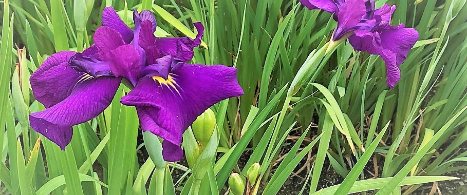 華やかで可愛らしいチューリップとは対照的な、その場で和歌でも詠いたくなるような趣深い菖蒲園を、すっかり和のムードに酔いしれて見渡していたとき、私の目に思いがけず、衝撃的な光景が飛び込んできました! それがこちらの紫の菖蒲です▼