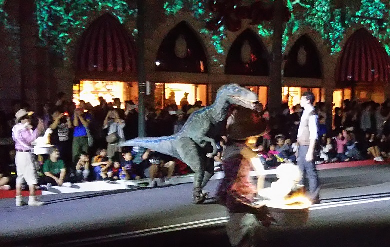 ナイトパレードにもいくつか出し物の種類があって、最初はハリーポッター、次がトランスフォーマー、ラストはミニオンズという順番なのですが、私は3番目の出し物『ジュラシックワールド』が目当てでした!☟ ←やっぱり恐竜か ヾ(-"-)