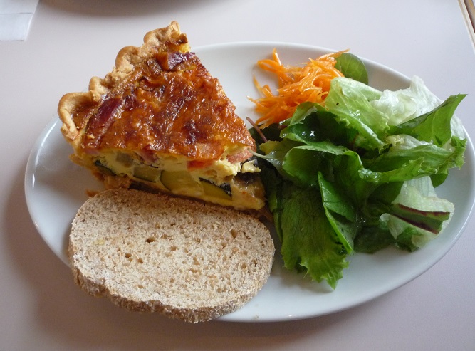 優麗な街並みにうっとりしながら進んでいくと、途中でふと、どこか懐かしい感じの喫茶店(『喫茶エレーナ』)を発見。この日は実は、朝食をたらふく食べすぎたせいで、ちゃんとしたランチを食べていなくて、とうにお昼を過ぎていたのですが、この店では ぎりぎりランチメニューをオーダーできる時間(14時前頃)だったので、表の看板に出ていたキッシュ・プレートに魅かれて、小腹を満たすべく入ってみました。朝食が胃もたれしているため軽めのランチが欲しかった私たちには、キッシュぐらいがちょうどいいかな、と思いまして。。。
